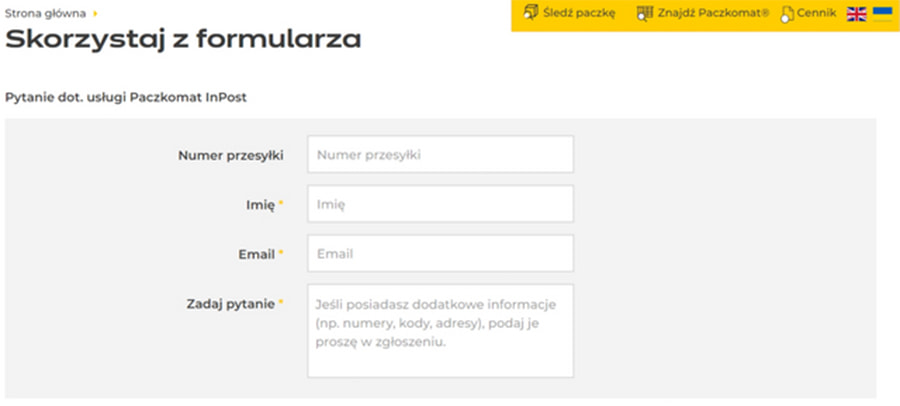 2. Skontaktuj się z InPost formularz kontaktowy w celu weryfikacji statusu przesyłki lub zgłoszenia oszustwa.